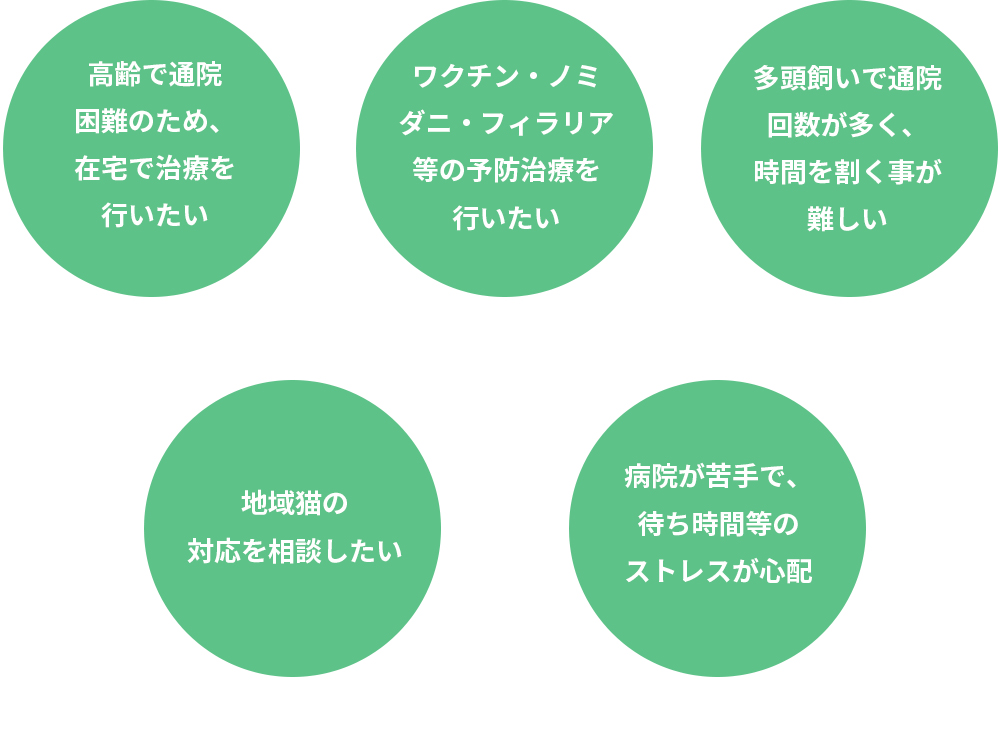 ・注射・皮下補液・点滴治療・投薬治療・外傷処置・慢性疾患の維持治療・終末期緩和ケアなど可能